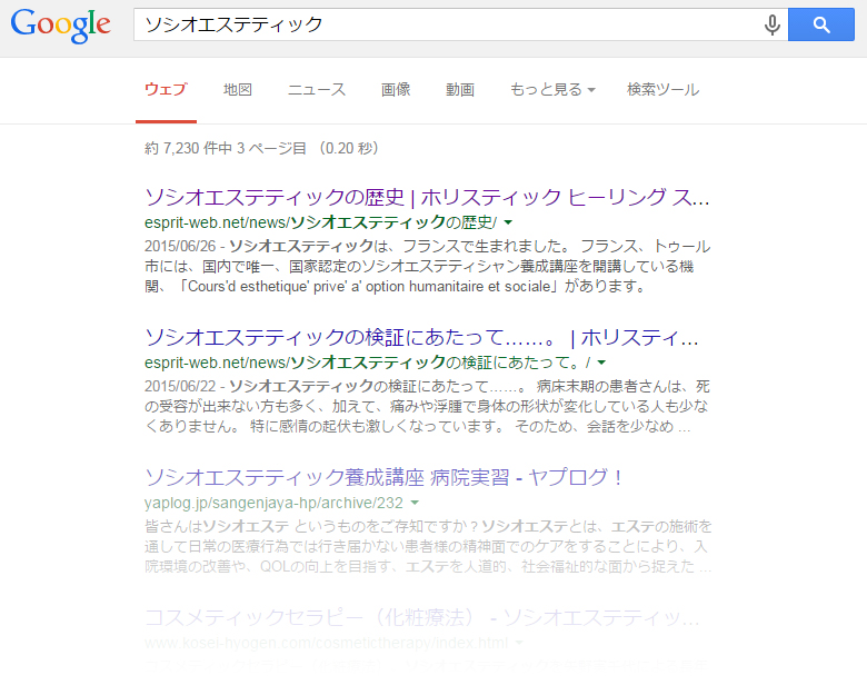 で、ちょこちょこ更新していたら、「ソシオエステティック」というワードで、Googleの検索順位が、3ページ目まで上がってきた!